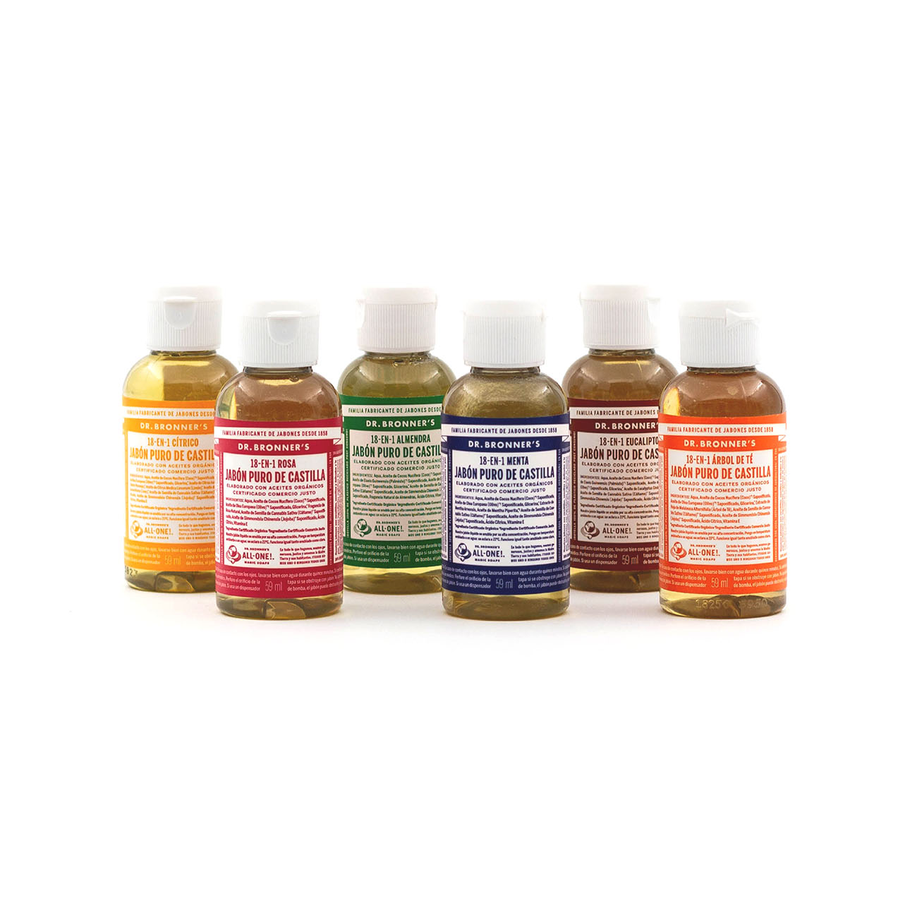 Jabón de Castilla líquido presentación de 59 ml elaborado con ingredientes de origen orgánico y provenientes de comercio justo, presentación de bolsillo.
